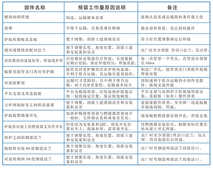 加熱爐及其它爐類產(chǎn)品可進(jìn)行工廠模塊化設(shè)計(jì)、預(yù)制、運(yùn)輸及現(xiàn)場安裝。采用思路:工廠深度預(yù)制一部件組合運(yùn)輸一現(xiàn)場快速組對(duì)安裝、調(diào)試。加熱爐模塊化設(shè)計(jì)及工廠模塊預(yù)制的優(yōu)點(diǎn)有:供貨范圍和各方責(zé)任清晰明確、減輕業(yè)主采購工作量、減少現(xiàn)場施工量及制作場地、能更好的保證施工工期和質(zhì)量、減少現(xiàn)場施工量及制作場地。我們可根據(jù)設(shè)計(jì)總圖提前進(jìn)行模塊化設(shè)計(jì)、確定模塊預(yù)制方案、模塊運(yùn)輸方案及現(xiàn)場拼裝方案,再報(bào)業(yè)主和設(shè)計(jì)方確認(rèn),從而節(jié)省設(shè)計(jì)時(shí)間。隨著加熱爐大型化的趨勢(shì),以及道路運(yùn)輸?shù)倪M(jìn)一步規(guī)范,工廠預(yù)制模塊的尺寸設(shè)計(jì)應(yīng)盡量能控制在:長22米,寬3.0米,高度3.3米以內(nèi)。